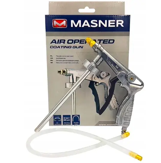 Uniwersalny pistolet do nanoszenia środków ochrony karoserii podwozia oraz profili zamkniętych. W zestawie posiada plastikowy wężyk, który umożliwia aplikowanie materiału w trudno dostępnych miejscach. Bardzo ergonomiczny, lekki, o solidnej konstrukcji.