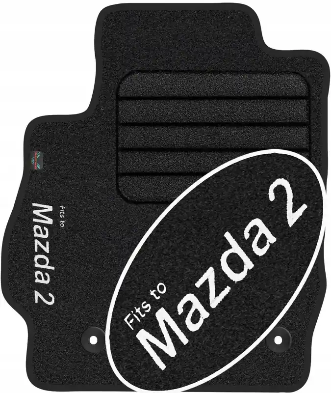 Na dywaniku wykonywany jest napis informacyjny metodą haftowania bezpośredniego na wykładzinie o treści ” Mazda 2 ” . Dzięki nowoczesnemu zapleczu produkcyjnemu oraz korzystaniem z wysokiej jakości materiałów i nici, haft na dywanikach jest wytrzymały i estetyczny co w dodatkowy sposób wpływa korzystnie na prezentację dywanika we wnętrzu samochodu. Treść napisu na dywaniku jest zgodna ze zdjęciem głównym (w zależności jest to model lub marka samochodu) a nad tym napisem delikatną czcionką naniesiony jest napis „Fits to”, który informuje o przeznaczeniu dywaników.