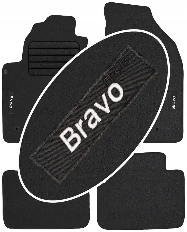 Na przednich dywanikach wykonywany jest napis informacyjny metodą wtopienia gotowej wgrzewki haftowanej o treści ” Bravo ” . Dzięki nowoczesnemu zapleczu produkcyjnemu oraz korzystaniem z wysokiej jakości materiałów i nici, haft na dywanikach jest wytrzymały i estetyczny co w dodatkowy sposób wpływa korzystnie na prezentację dywaników we wnętrzu samochodu. Treść napisu na dywanikach jest zgodna ze zdjęciem głównym (w zależności jest to model lub marka samochodu) a nad tym napisem delikatną czcionką naniesiony jest napis „Fits to”, który informuje o przeznaczeniu dywaników.