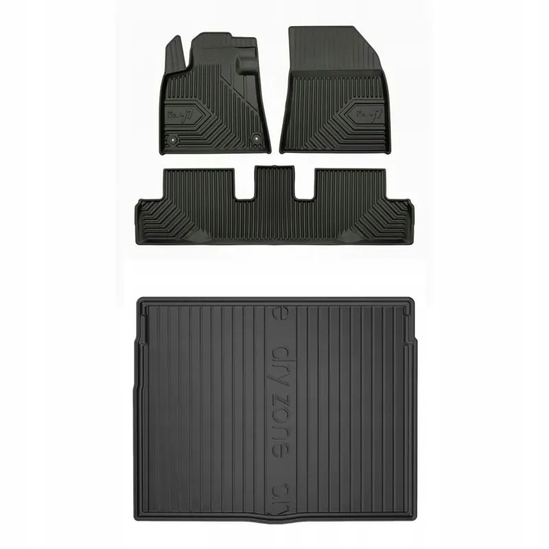 Oryginalne, wysokiej jakości dywaniki samochodowe firmy FROGUM z serii No.77 wykonane z elastomeru plastycznego (TPE) w kolorze czarnym w zestawie z wkładką do bagażnika serii Dryzone.