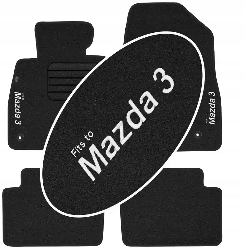 Na przednich dywanikach wykonywany jest napis informacyjny metodą haftowania bezpośredniego na dywanikach o treści ” Mazda 3 ” . Dzięki nowoczesnemu zapleczu produkcyjnemu oraz korzystaniem z wysokiej jakości materiałów i nici, haft na dywanikach jest wytrzymały i estetyczny co w dodatkowy sposób wpływa korzystnie na prezentację dywaników we wnętrzu samochodu. Treść napisu na dywanikach jest zgodna ze zdjęciem głównym (w zależności jest to model lub marka samochodu) a nad tym napisem delikatną czcionką naniesiony jest napis „Fits to”, który informuje o przeznaczeniu dywaników.