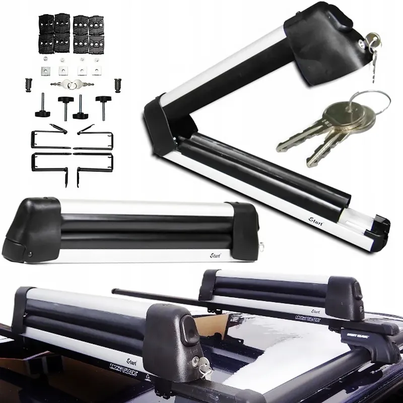 Para uniwersalnych uchwytów narciarskich na parę nart lub 4 deski snowboardowe. Z kluczem antykradzieżowym System przesuwny ułatwia załadunek i przechowywanie nart. WYPOSAŻENIE: Wspornik do stalowych relingów bagażnika dachowego (maks. 57×60 mm) Złącza do aluminiowych relingów dachowych z profilem „T”