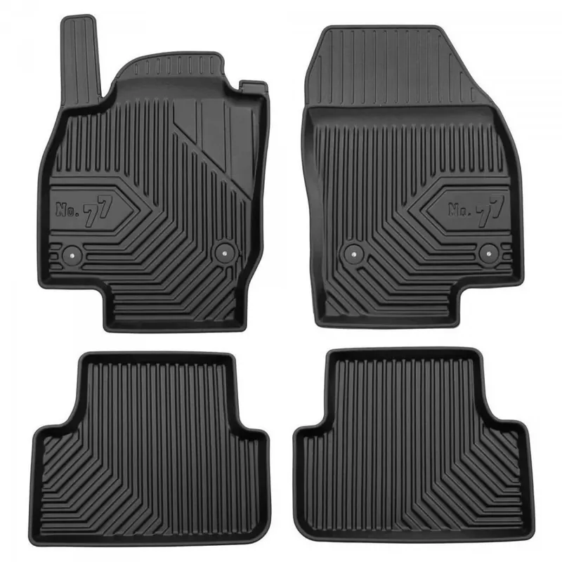 Oryginalne, wysokiej jakości dywaniki samochodowe firmy FROGUM z nowej serii No. 77. Wykonane z elastomeru plastycznego (TPE) w kolorze czarnym. Dzięki zastosowaniu najwyższej jakości tworzywa charakteryzują się niespotykaną odpornością na wycieranie. Wysoki, trójwymiarowy brzeg ochronny zabezpiecza podłogę samochodu, powierzchnie boczną tapicerki oraz podstopnicę łącznie z wykładziną pod pedałami. Zalety dywaników z serii No.